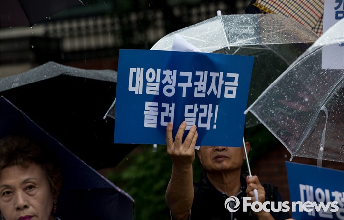 (서울=포커스뉴스) 22일 오후 서울 중구 신당동 김종필 전 총리 자택 앞에서 일제 강제동원희생자유가족협동조합 및 아시아태평양 전쟁희생자 한국유족회 회원들이 '한일협정 당시 일본외상 오히라 와 메모로 합의한 역사의 진실을 밝힐 것'을 촉구하고 있다.