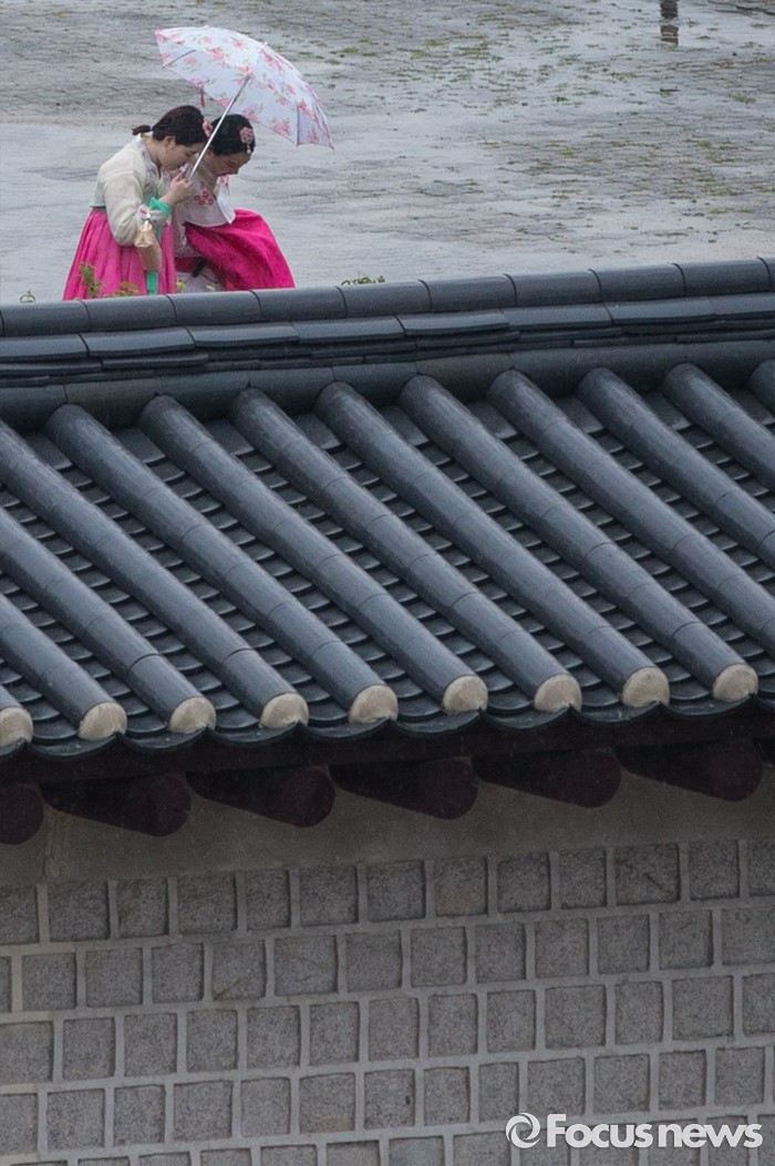 (서울=포커스뉴스) 중부지방에 첫 장맛비가 내리는 22일 오후 서울 경복궁에서 관광객들이 빗줄기 속에 나들이를 즐기고 있다. 기상청은 이번 장마전선이 오늘 밤 다시 남하해 비가 소강상태를 보였다가 모레 다시 북상할 것으로 전망했다.
