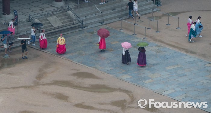 (서울=포커스뉴스) 중부지방에 첫 장맛비가 내리는 22일 오후 서울 경복궁에서 관광객들이 빗줄기 속에 나들이를 즐기고 있다. 기상청은 이번 장마전선이 오늘 밤 다시 남하해 비가 소강상태를 보였다가 모레 다시 북상할 것으로 전망했다.