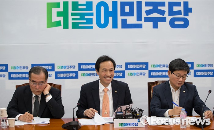 (서울=포커스뉴스) 우상호(가운데) 더불어민주당 원내대표가 22일 오후 서울 여의도 국회에서 열린 더불어민주당 세월호 TF 회의에 참석해 활짝 웃고 있다.