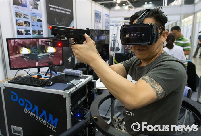 (고양=포커스뉴스) 22일 오후 경기 고양시 킨텍스 7홀에서 열린 2016 로보유니버스 & VR 서밋에 방문한 한 시민이 VR 기기를 체험하고 있다.