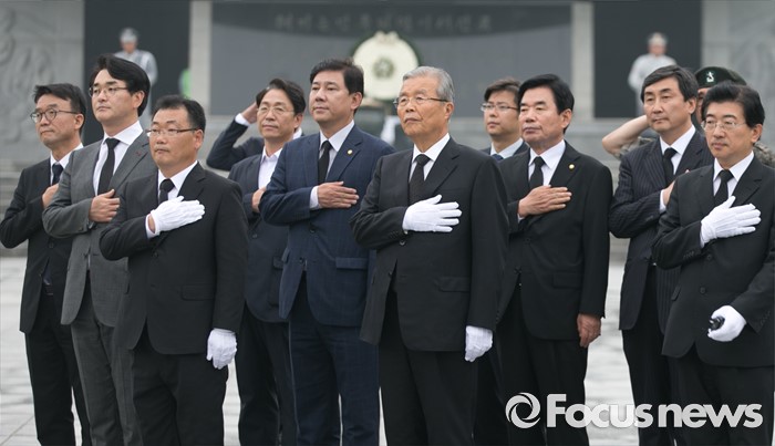 (서울=포커스뉴스) 김종인 더불어민주당 비대위 대표와 의원들이 22일 오후 서울 동작구 국립서울현충원 내 국방부 유해발굴감식단 방문에 앞서 현충탑 참배를 마친 뒤 나서며 국기에 대한 경례를 하고 있다.