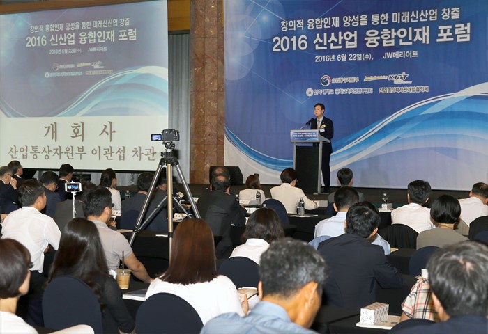 (서울=포커스뉴스) 이관섭 산업통상자원부 1차관이 서울 반포동 메리어트호텔 그랜드볼룸에서 미래융합 신산업 분야를 선도할 청년인재 양성을 위한 산업계와 공학교육혁신센터 간 장기적 협력 네트워크 구축을 위해 열린 '2016 신산업융합인재포럼'에 참석해 환영사를 하고 있다. 이날 포럼에는 이채익·윤한홍 국회의원, 정재훈 산업기술진흥원장, 최순자 인하대 총장, 손 욱 서울대 차세대융합기술원 센터장, 주원종 서울과학기술대 교수, 이재근 IT비즈니스진흥협회 부회장, 염동관 플랜트산업협회 부회장, 김호열 바이오협회 부회장, 김태평 메디코넥스 대표를 비롯한 공학교육혁신센터 및 산학연 관계자 250여명이 참석했다. <사진제공=산업통상자원부>