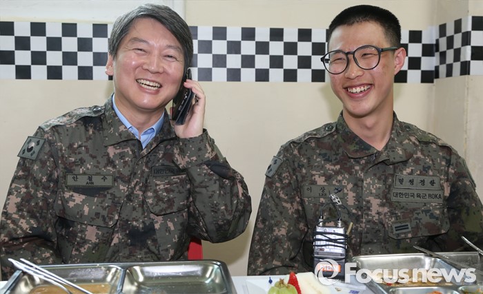 이에 질세라 국민의당도 23일부터 안보 행보를 이어가면서 하면서 두 야당 간 '안보 정당' 경쟁에 관심이 쏠리고 있다.안철수(왼쪽) 국민의당 상임공동대표가 지난 5월 경기도 연천 전방부대를 방문해 장병들과의 오찬 중 이상석 장병의 어머니와 통화를 하고 있다. 2016.05.12 사진공동취재단