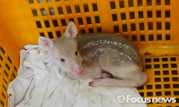 (파주 포커스뉴스) 흰고라니 새끼가 23일 오전 파주시 문산읍에서 자신을 구조한 강현철씨의 농막에서 하루가 다르게 성장하고 있다. 몸은 전체적으로 보호색 무늬가 있으나 하얀빛을 띠고 있다.<사진제공=노영대 한국자연정보원 원장>