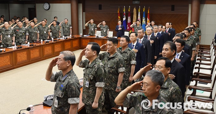 (서울=포커스뉴스) 북한이 무수단급 중거리 탄도미사일을 발사한 다음날인 23일 오전 서울 용산구 국방부 대회의실에서 열린 '2016년 전반기 전군 주요지휘관 회의'에 참석한 한민구 국방부 장관과 전군 지휘관들이 국민의례를 하고 있다.