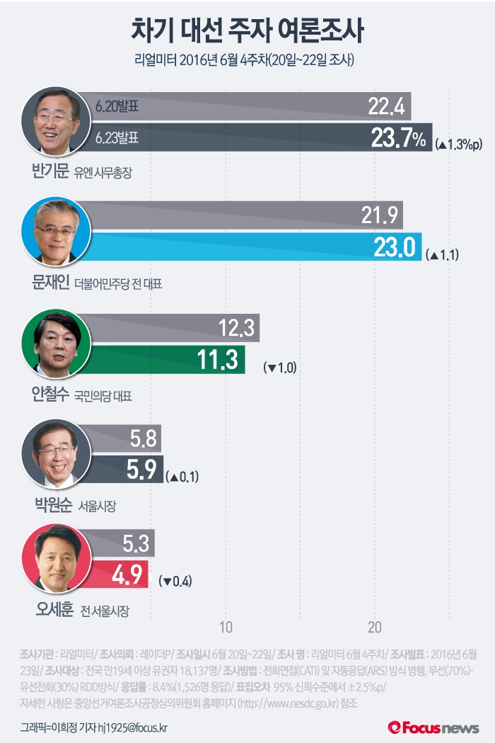 (서울=포커스뉴스) 여론조사 전문기관 리얼미터가 23일 발표한 6월 4주차 주간동향 여론조사 결과에 따르면 반기문 유엔 사무총장과 문재인 전 더불어민주당대표가 지난주와 비슷한 지지도를 보이며 양강구도를 이어가고 있다.