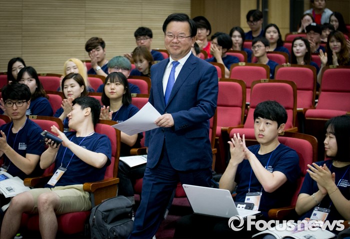 (서울=포커스뉴스) 전당대회 불출마를 선언하고 대권 도전을 시사한 김부겸 더불어민주당 의원이 23일 오전 서울 여의도 국회 의원회관에서 열린 대학생리더십 아카데미에 참석해 특강을 위해 단상으로 향하고 있다.