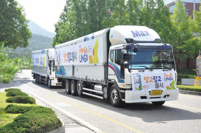 또한 하이트 맥주 모델인 송중기를 '망고링고' 홍보에도 활용할 계획이다.과일믹스 '망고링고'가 하이트진로 전주공장에서 출고되고 있다.<사진제공=하이트진로>