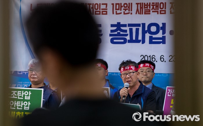 (서울=포커스뉴스) 23일 오전 서울 중구 민주노총 대회의실에서 열린 '민주노총 총파업ㆍ총력투쟁 선포' 기자회견에 참석한 최종진 수석부위원장이 총파업을 결의하는 발언을 하고 있다.