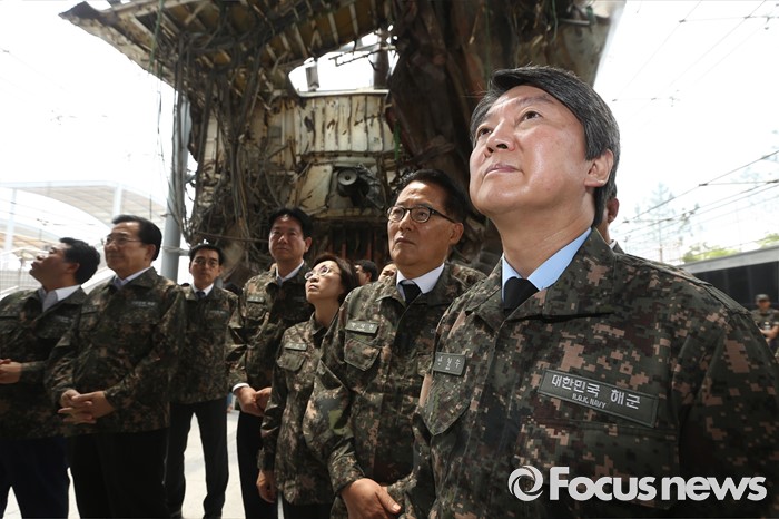 (서울=포커스뉴스) 안철수 국민의당 상임공동대표, 박지원 원내대표 등 의원들이 23일 오전 경기도 평택 해군 제2함대 사령부를 방문해 천안함 단면부를 둘러보고 있다.