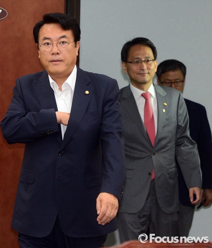 (서울=포커스뉴스) 23일 오후 서울 여의도 국회에서 열린 정보위원회 전체회의에 정진석(왼쪽) 새누리당 원내대표와 이창재 법무부 차관이 참석하고 있다.