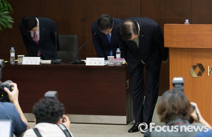 (서울=포커스뉴스) 23일 오후 서울 영등포구 KDB산업은행 본점에서 열린 산업은행 혁신 추진방안 기자간담회에 참석한 이동걸(오른쪽) KDB산업은행 회장과 임원들이 혁신 추진방안을 발표하며 사죄 인사를 하고 있다.
