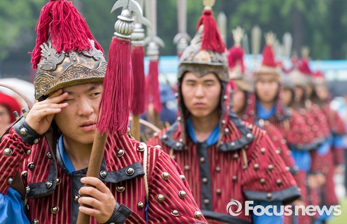 (서울=포커스뉴스) 23일 오후 서울광장에서 열린 '왕궁수문장 20주년 기념행사'에 참석한 관계자가 땀을 닦고 있다.