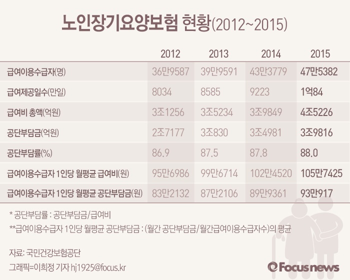 (서울=포커스뉴스) 23일 국민건강보험공단이 발표한 ‘2015 노인장기요양보험통계연보’에 따르면 급여이용수급자 수는 2015년 47만5000명으로 2008년대비 약 3.2배 증가했다.