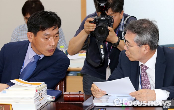 (세종=포커스뉴스) 박준성(오른쪽) 최저임금위원회 위원장이 23일 오후 세종시 정부세종청사 고용노동부 최저임금위원회 전원회의실에서 열린 5차 전원회의에 앞서 류경희 부위원장과 대화하고 있다.