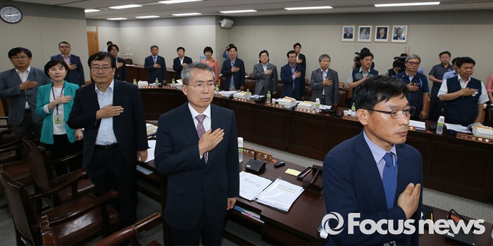 (세종=포커스뉴스) 박준성 최저임금위원회 위원장괴 위원들이 23일 오후 세종시 정부세종청사 고용노동부 전원회의실에서 열린 5차 전원회의에 앞서 국기에 대한 경례를 하고 있다.