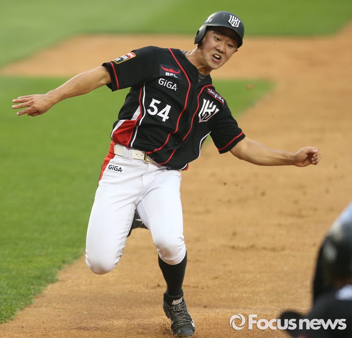 (서울=포커스뉴스) 23일 서울 잠실구장에서 열린 2016 프로야구 kt-두산 경기 2회초 1사 만루에서 kt 박기혁의 좌전 안타때 2루주자 전민수가 홈으로 뛰어들고 있다.