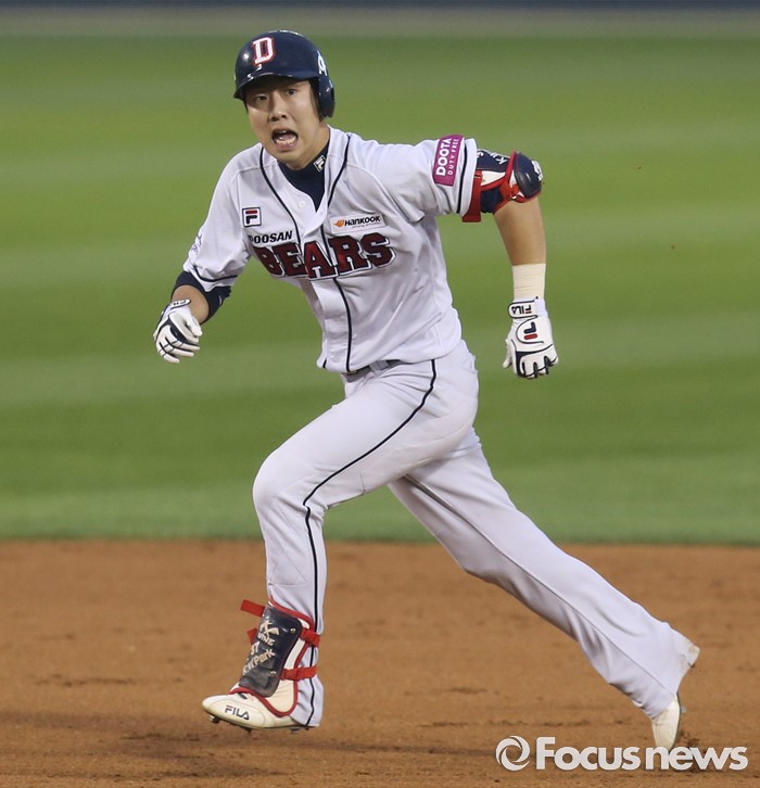 (서울=포커스뉴스) 23일 서울 잠실구장에서 열린 2016 프로야구 kt-두산 경기 3회말 1사 1루에서 두산 박건우가 주자를 불러 들이는 우중간 2루타를 치고 3루를 향해 달리고 있다.