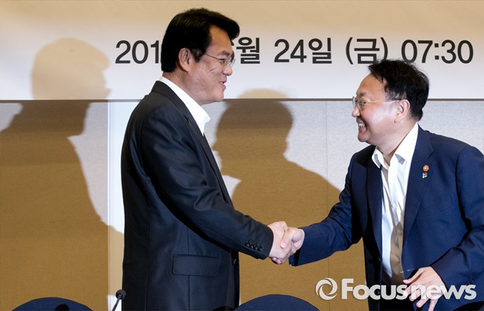 (서울=포커스뉴스) 24일 오전 서울 여의도 국회 귀빈식당에서 열린 2016년 하반기 경제정책방향 당정간담회에 참석한 정진석(왼쪽) 새누리당 원내대표와 유일호 경제부총리 겸 기획재정부 장관이 인사하고 있다.