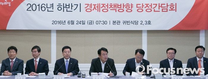 (서울=포커스뉴스) 24일 오전 서울 여의도 국회 귀빈식당에서 열린 2016년 하반기 경제정책방향 당정간담회에 참석한 정진석 새누리당 원내대표가 인사말을 하고 있다. 왼쪽부터 권성동 법사위원장, 조경태 기재위원장, 김광림 정책위의장, 정 원내대표, 유일호 경제부총리, 이동필 농림축산식품부 장관, 주형환 산업통상자원부 장관.