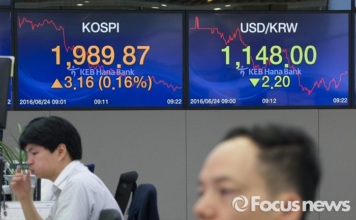 (서울=포커스뉴스) 영국의 유럽연합(EU) 탈퇴를 의미하는 '브렉시트' 국민 투표 개표가 진행되는 24일 오전 서울 중구 KEB 하나은행 명동 본점 딜링룸에서 딜러들이 업무를 보고 있다. 이날 코스피지수는 브리메인 기대에 2000p를 돌파했으나 다시 하락해 1900p대를 유지하고 있다.