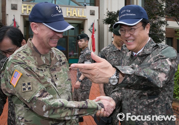 (의정부=포커스뉴스) 정진석(오른쪽) 새누리당 원내대표가 24일 오전 경기도 의정부 미2사단 한미연합사단을 방문해 테드 마틴 미2사단장과 악수하고 있다.
