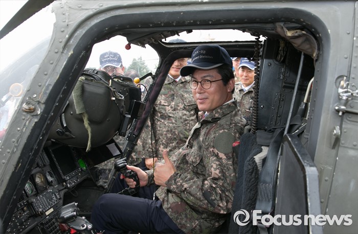 (의정부=포커스뉴스) 새누리당 소속 김영우 국회 국방위원장이 24일 오전 경기도 의정부 미2사단 한미연합사단을 방문해 부대현황 보고를 받은 뒤 카이오와 워리어 탑승체험을 하고 있다.