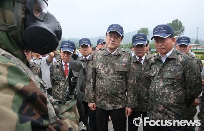 (의정부=포커스뉴스) 정진석 새누리당 원내대표 등 의원들이 24일 오전 경기도 의정부 미2사단 한미연합사단을 방문해 부대현황 보고를 받은 뒤 화학전 장비에 대한 설명을 듣고 있다.