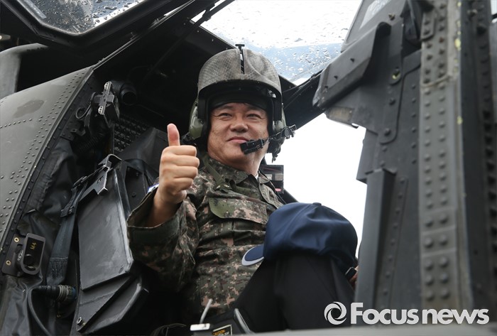 (의정부=포커스뉴스) 정진석 새누리당 원내대표가 24일 오전 경기도 의정부 미2사단 한미연합사단을 방문해 부대현황 보고를 받은 뒤 아파치 헬기 탑승체험을 하고 있다.
