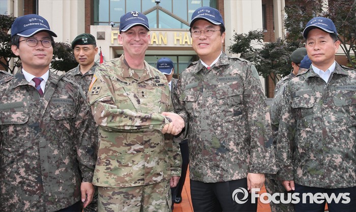 (의정부=포커스뉴스) 정진석 새누리당 원내대표가 24일 오전 경기도 의정부 미2사단 한미연합사단을 방문해 테드 마틴 미2사단장과 악수하고 있다. 왼쪽부터 김영우 국방위원장, 테드 마틴 사단장, 정 원내대표, 김명연 원내대변인.