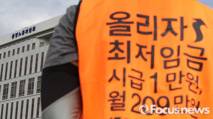 한편 최저임금위원회는 오는 28일 내년도 최저임금을 발표한다.(세종=포커스뉴스) 민주노총 세종충남본부 조합원들이 16일 오후 정부세종청사 고용노동부 앞에서 최저임금 1만원 쟁취 집회를 갖고 있다. 이날 최저임금위원회 4차 전체회의가 열렸다. 2016.06.16 김기태 기자