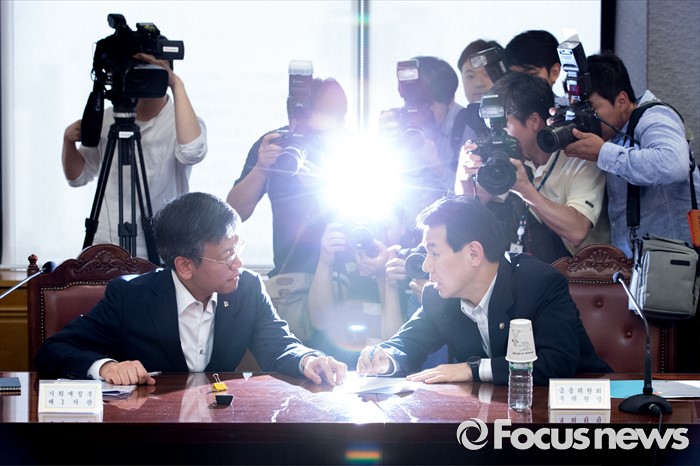 (서울=포커스뉴스) 24일 오후 서울 중구 전국은행연합회에서 최상목(왼쪽) 기획재정부 제1차관과 정은보 금융위원회 부위원장이 브렉시트 관련 긴급거시경제금융회의에 참석해 대화하고 있다.