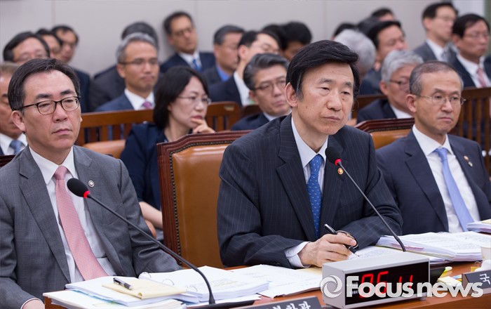 (서울=포커스뉴스) 24일 오전 서울 여의도 국회에서 열린 외교통일위원회 전체회의에 참석한 윤병세(가운데) 외교부 장관과 차관들이 의원들의 질의를 듣고 있다.