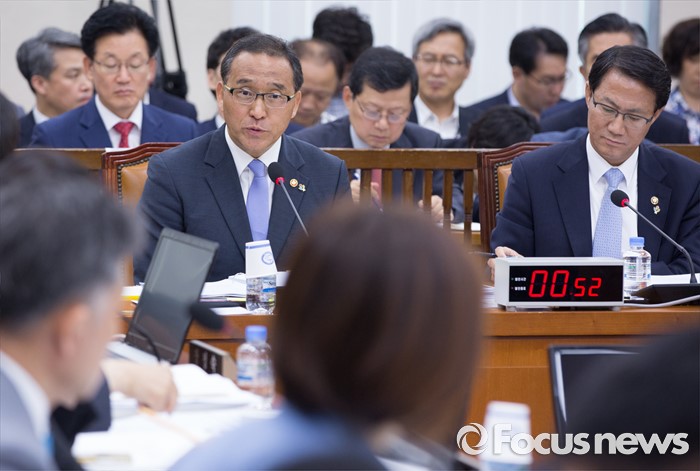 (서울=포커스뉴스) 24일 오전 서울 여의도 국회에서 열린 안전행정위원회 전체회의에 참석한 홍윤식(왼쪽) 행정자치부 장관이 의원들의 질의에 답하고 있다.