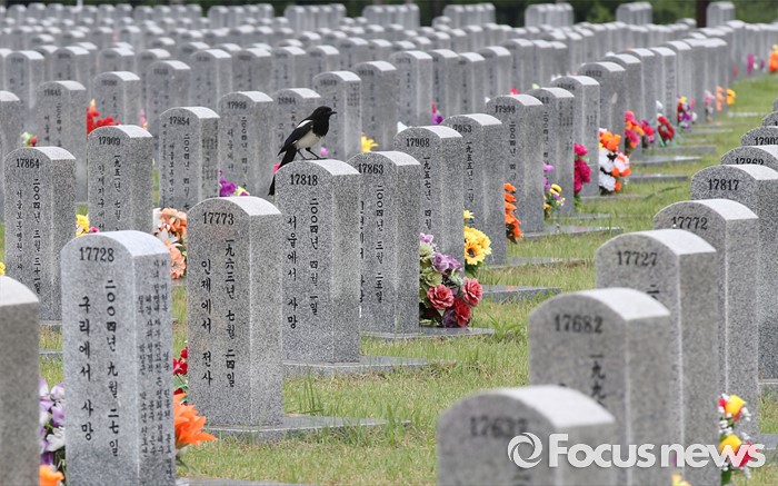 (대전=포커스뉴스) 6·25전쟁 66주년을 하루 앞둔 24일 오후 대전 유성구 국립대전현충원 사병 묘비에 까치가 앉아 있다.