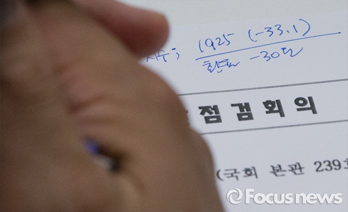 (서울=포커스뉴스) 24일 오후 서울 여의도 국회에서 열린 새누리당 브렉시트(Brexit) 관련 긴급현안 점검회의에 참석한 한 의원이 이날 마감된 코스피 및 환율 지수를 메모하고 있다.
