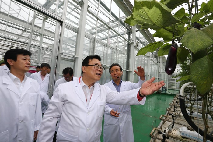 (진주=포커스뉴스) 이동필 농림축산식품부 장관이 24일 경남 진주시 경남도농업기술원 첨단농업에서 열린스마트 팜 확산 상반기 점검회의에 참석전 경남도농업기술원 'ATEC 첨단온실' 스마트 팜 재배 시설을 둘러보고 있다. <사진제공=농림축산식품부>