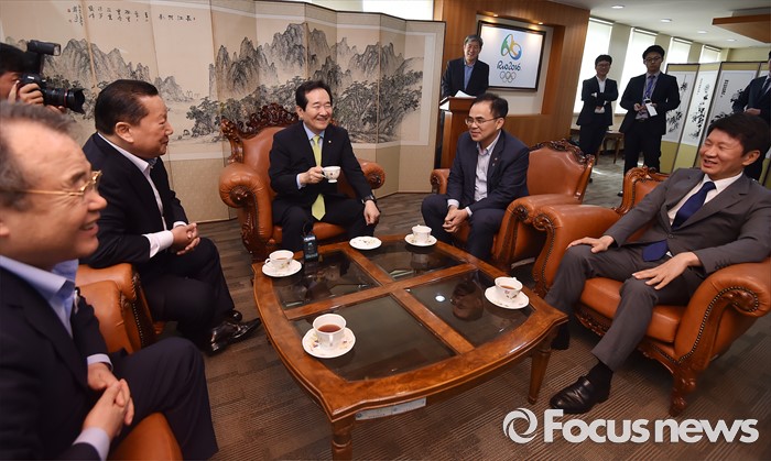 (서울=포커스뉴스) 정세균(왼쪽 세번째) 국회의장이 24일 오후 서울 노원구 태릉선수촌을 방문해 김정행 대한체육회장 등 브라질 리우 올림픽 준비위원회 관계자들과 대화하고 있다.