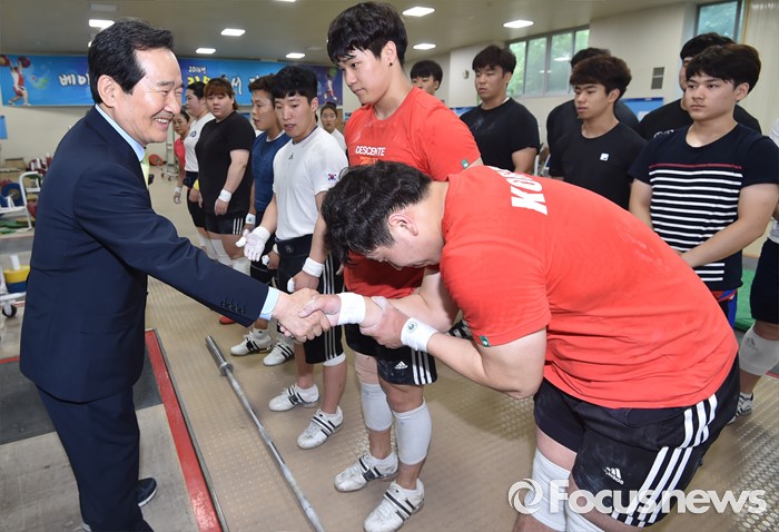 (서울=포커스뉴스) 정세균(왼쪽) 국회의장이 24일 오후 서울 노원구 태릉선수촌을 방문해 브라질 리우 올림픽을 앞두고 훈련 중인 역도 국가대표 선수들을 격려하고 있다.