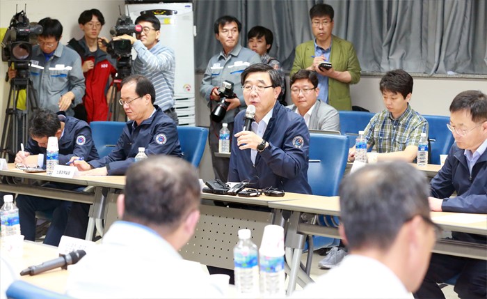 (거제=포커스뉴스) 이기권 고용노동부 장관이 24일 경남 거제를 방문하여 대우조선해양 및 삼성중공업 협력업체와 간담회를 갖고 업황 부진으로 어려움을 겪는 조선업 종사자 의견을 청취하고 있다. <사진제공=고용노동부>