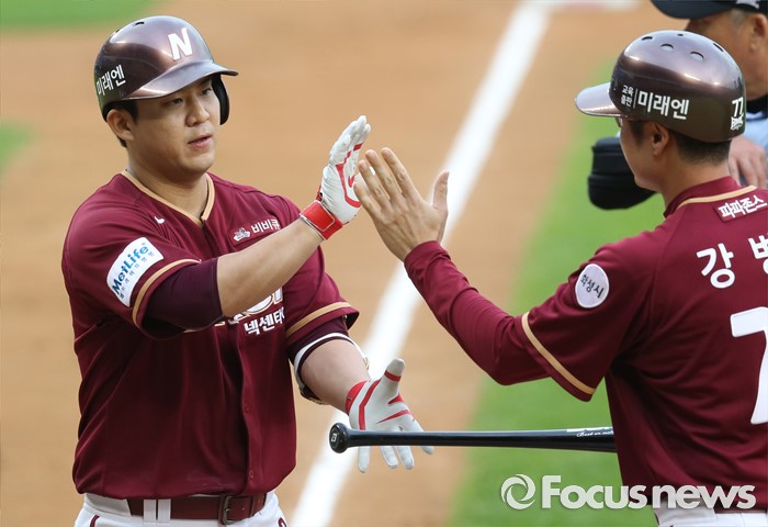 (서울=포커스뉴스) 24일 서울 잠실구장에서 열린 2016 프로야구 넥센-LG 경기 1회초 2사 1,3루에서 넥센 김민성이 좌월 3점 홈런을 치고 강병식 코치의 환영을 받으며 홈인하고 있다.