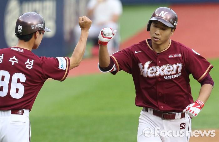 (서울=포커스뉴스) 24일 서울 잠실구장에서 열린 2016 프로야구 넥센-LG 경기 1회초 1사후 넥센 고종욱이 우월 솔로 홈런을 치고 3루를 돌며 정수성 코치의 환영을 받고 있다.
