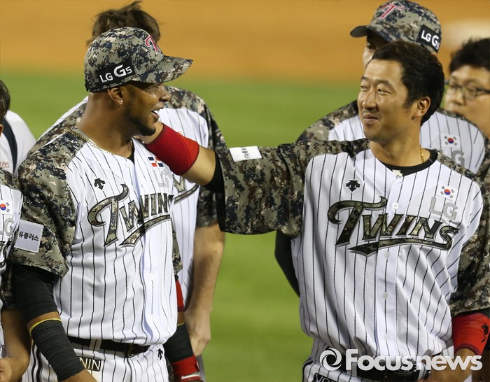 (서울=포커스뉴스) 24일 서울 잠실구장에서 열린 2016 프로야구 넥센-LG 경기에서 LG 이병규가 3점 홈런으로 역전승을 이끈 히메네스의 머리를 쓰다듬고 있다.