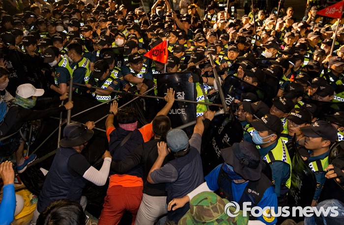 (서울=포커스뉴스) 24일 오후 서울 서초구 현대자동차 본사 앞에서 열린 '유성기업 故 한광호씨 100일ㆍ현대차 진격의 날' 집회에 참석한 노동자들과 경찰이 충돌을 빚고 있다.