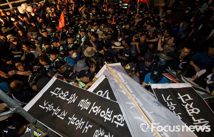 (서울=포커스뉴스) 24일 오후 서울 서초구 현대자동차 본사 앞에서 열린 '유성기업 故 한광호씨 100일ㆍ현대차 진격의 날' 집회에 참석한 노동자들과 경찰이 충돌을 빚고 있다.