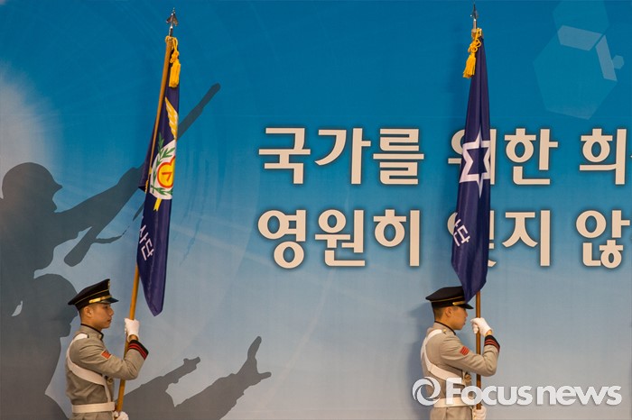 (서울=포커스뉴스) 25일 오전 서울 송파구 잠실실내체육관에서 열린 '6.25전쟁 66주년 기념식'에서 군인들이 사단기를 들고 퇴장하고 있다.