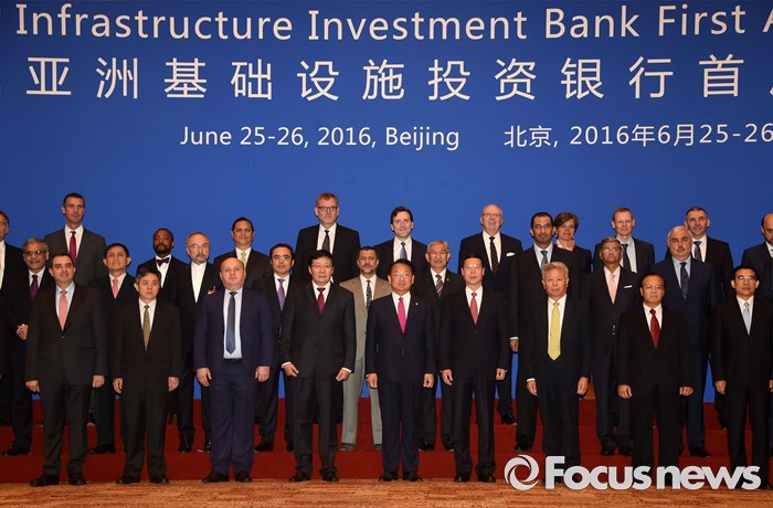 (서울=포커스뉴스) 유일호 부총리 겸 기획재정부 장관이 25일 중국 북경 월드호텔에서 열린 '제1차 아시아인프라개발은행(AIIB) 연차총회' 참석,각국 대표들과 기념촬영을 하고 있다.<사진제공=기획재정부>