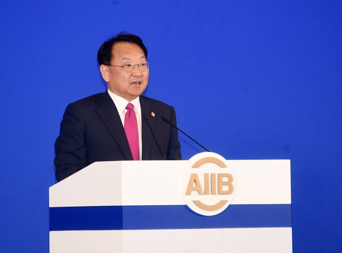 (서울=포커스뉴스) 유일호 부총리 겸 기획재정부 장관이 25일 중국 북경 월드호텔에서 열린 '제1차 아시아인프라개발은행(AIIB) 연차총회' 참석해 기조연설을 하고 있다. <사진제공=기획재정부>