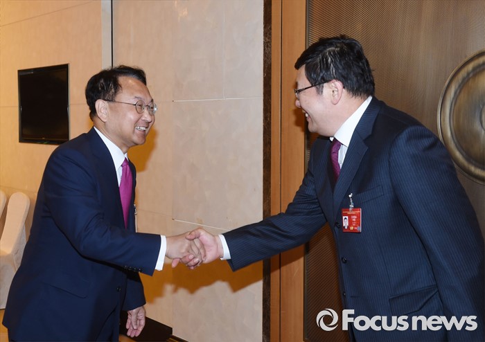 (서울=포커스뉴스) 제1차 아시아인프라개발은행(AIIB) 연차총회 참석차 중국 북경을 방문중인 유일호 부총리 겸 기획재정부 장관이 25일 월드호텔에서 러우 지웨이 중국 재무장관과 면담에 앞서 악수하며 인사를 나누고 있다. <사진제공=기획재정부>